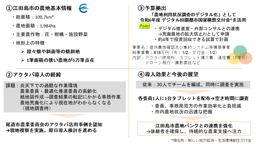 江田島市農業委員会は、アクタバの導入予算として「デジタル田園都市国家構想交付金」を活用することにしました。